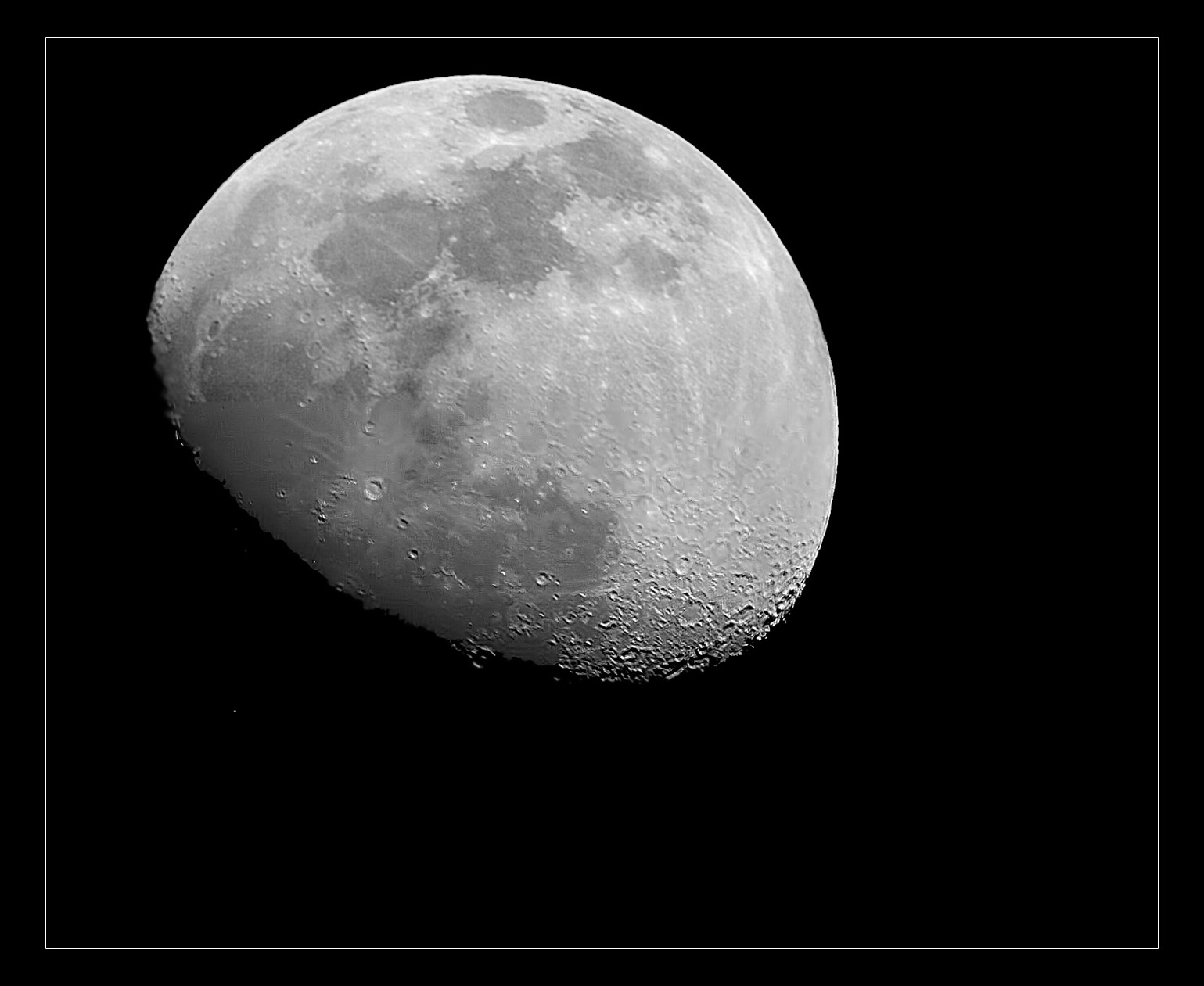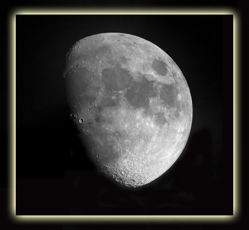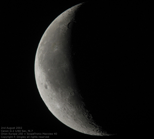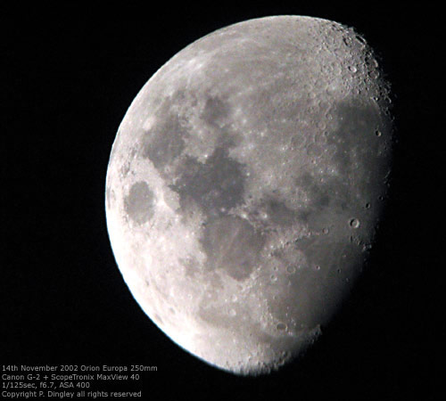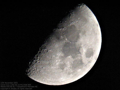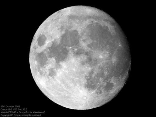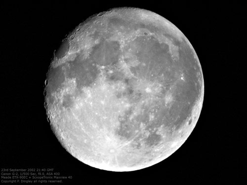 © P. DingleyLunar photograph taken at 16-days past the New Moon on 23rd September 2002 at 21:40 GMT using a Canon G-2 digital camera and a Meade ETX-90EC.No filters were used, although the resulting image converted to monochrome using Adobe Photoshop 7 - which was also used to increase the contrast and to sharpen the image slightly.