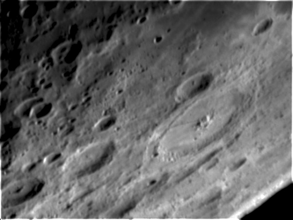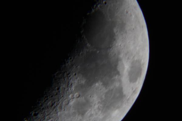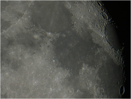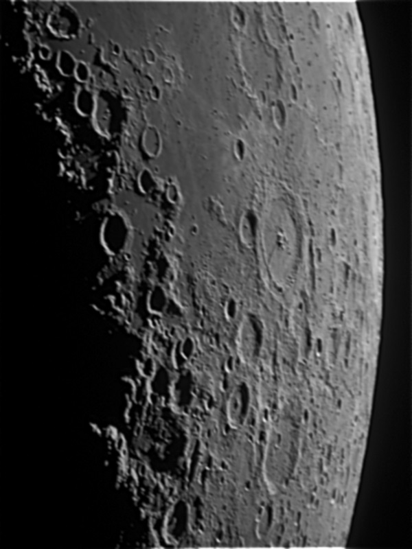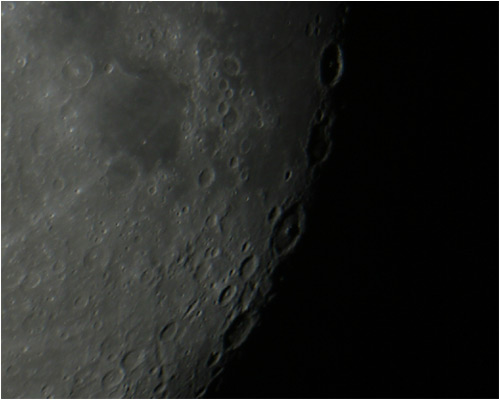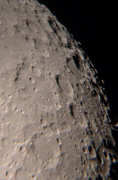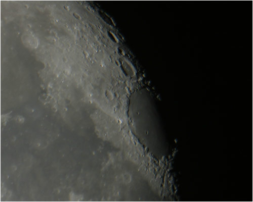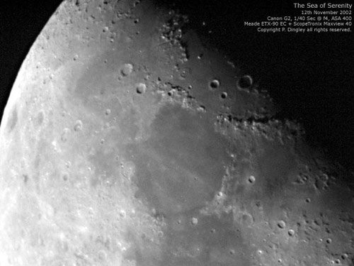 © P. DingleyLunar photo taken on 14th March 2003 at 20:45 GMT using a Canon D60 digital camera at prime focus of the Sherwood Observatory 61cm Newtonian Reflector.In this photograph the large area towards the right is Mare Crisium (the Sea of Crises), named by Riccioli in 1651. Mare Crisium has two small but clearly defined craters on its surface (plus a lot that can't be seen in this image).