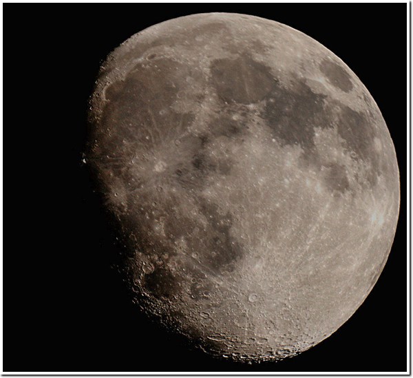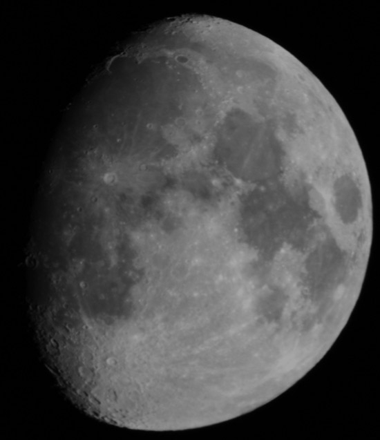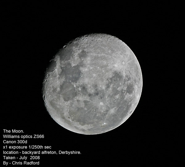 © C. MilhouseThis picture of the waxing gibbous Moon was taken by C. Millhouse, and submitted to the December '08 members photo competition. The picture was taken from Blidworth, using a Canon 400D camera at 1/250th second ISO800. The camera was mounted at the prime focus of a SkyWatcher SkyMax 127 telescope.