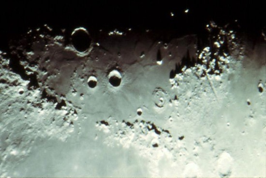 © G. JenkinsonThis photograph shows the lunar alps, the craters Archimedes (83km diameter), Autolycus (39km), Aristillus (55km) and many more. If you look towards the bottom left of the photograph you can also see the Alps vallis (180 km long). The picture was taken by Graham Jenkinson, using a 12 inch F6 telescope and Kodak elite-chrome 400asa film using eyepiece projection and a 9mm eyepiece, with a 3/4 second exposure.