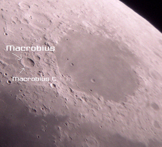 © G. ShepherdThis picture of the Lunar crater Macrobius, with the smaller Macrobius-C was taken by society member Mr G. Shepherd using a Nikon Coolpix 4300 digital camera, through the society's 61-cm reflecting telescope, and was submitted for the May 2007 members photograpg competition.Macrobius is N.W. of the Mare Crisium.