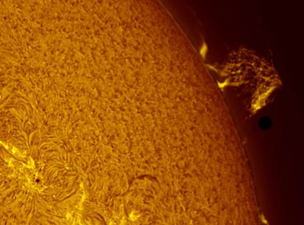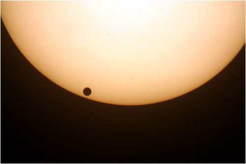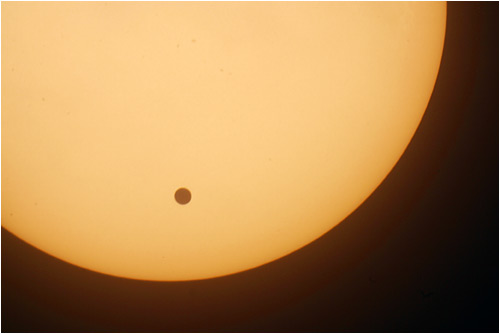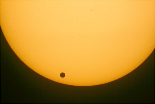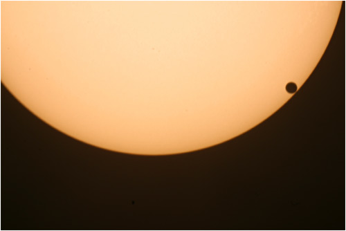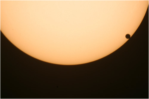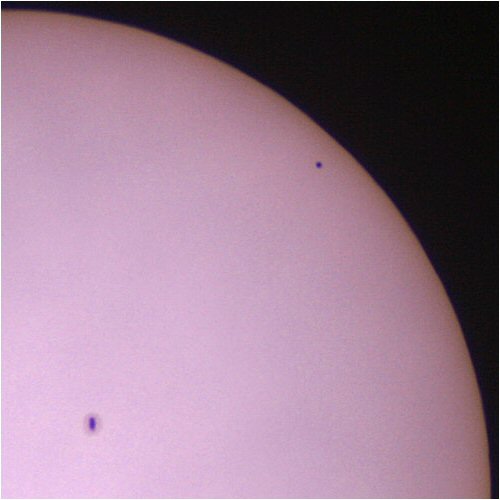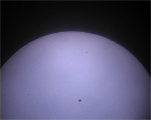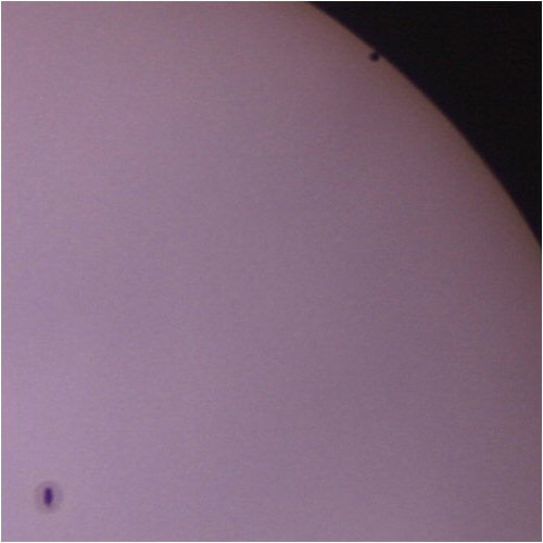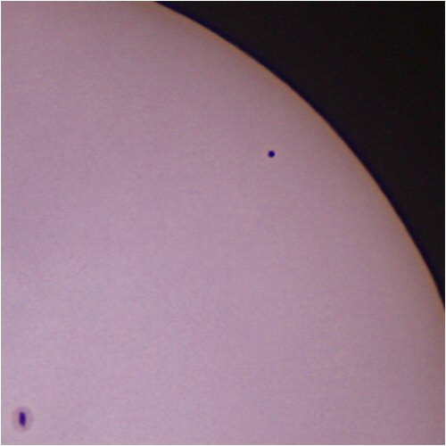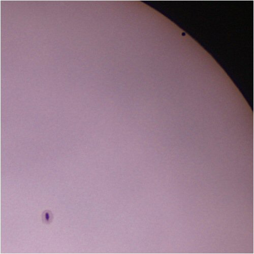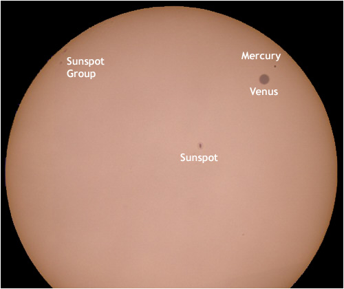 © P. DingleyOver the last couple of years in the U.K. we have been graced by transits of both Mercury (2003) and Venus (2004), both of which were visible in their entirety from the Sherwood Observatory.The image below shows the difference in scale between the size of Mercury, seen transiting the Sun on the 7th May 2003, and Venus, seen transiting the Sun on the 8th June 2004. Two images, both taken within an hour of third contact, have been overlaid, and rescaled so that the Sun is the same size in each image.