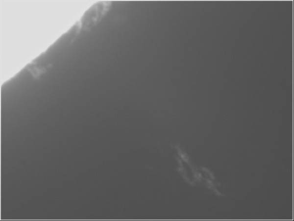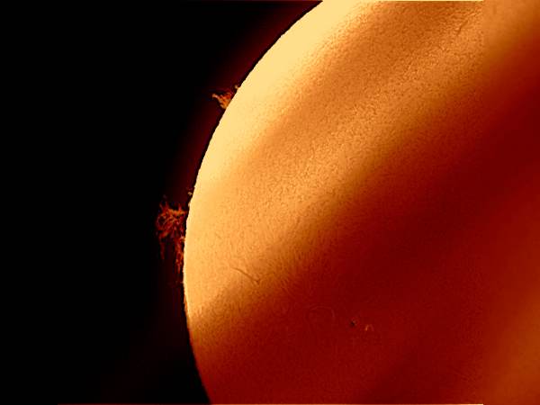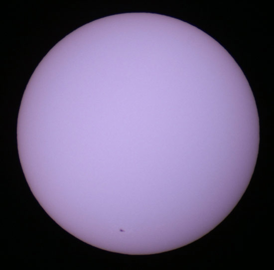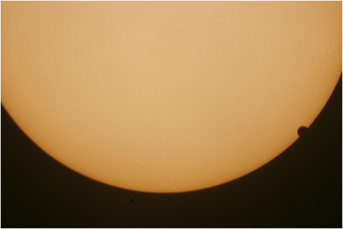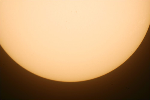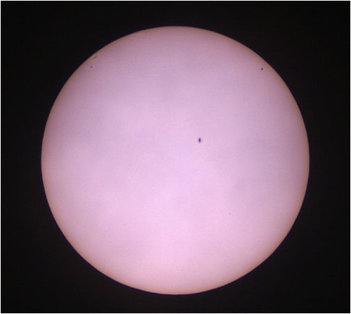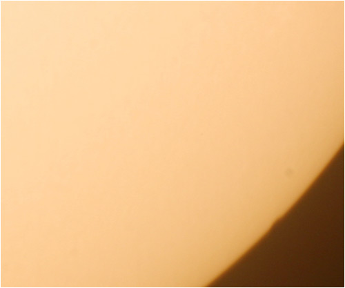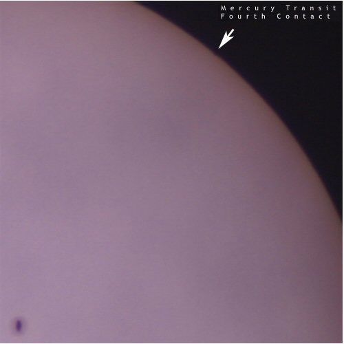 © P. DingleyThe Sun on 7th May 2003 using a Canon D60 digital camera and a Celestron C-150 6 inch Refractor with a hand-made $15 Solar Filter.The last few seconds of the 2003 Mercury Transit seems Mercury barely visible as it moves away from the face of the sun. Fourth contact is within a few seconds of this photo being taken.