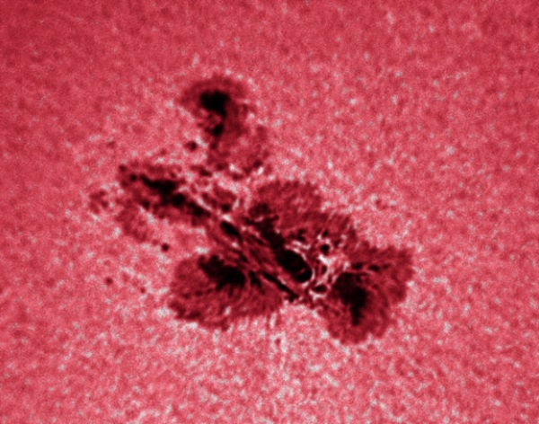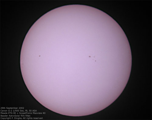 © P. DingleyThe Sun on 29th September 2002 at 15:00 GMT using a Canon G-2 digital camera and a Meade ETX-90-EC with a hand-made $15 Solar Filter.Two clusters of sun-spots are clearly visible in the image, one to the left, and one just off centre to the right, with a third cluster just visible near the extreme left side of the image.