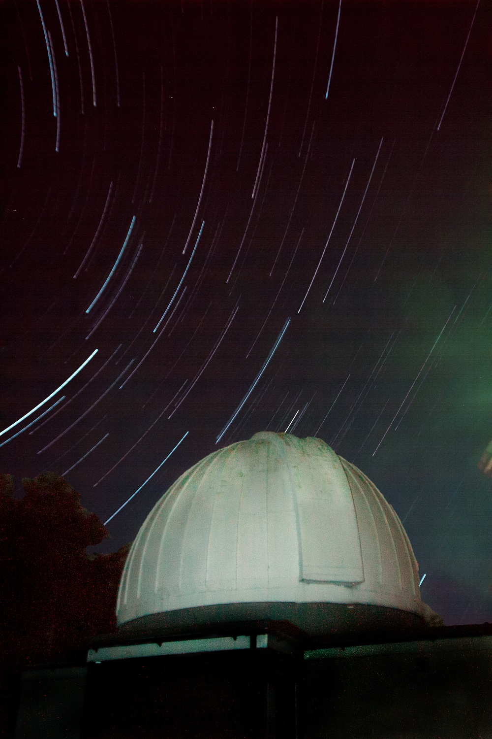 © Peter JenkinsStar Trails over Sherwood Observatory. 36 exposures 30s long with 10 sec gaps between frames at f5.6 ISO400 Canon 60D with Sigma 10-20mm zoom set at 12mm.Camera controlled with DSLR Controller (to set frame timelapse details) running over wireless connection from my Android tablet to the Canon.