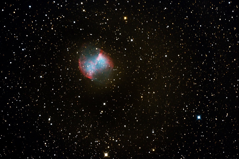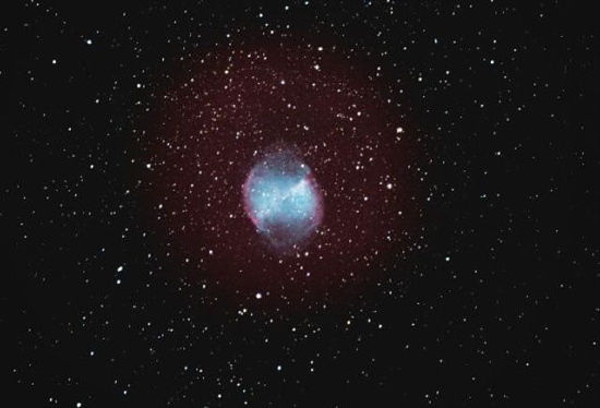 © P. JenkinsThis image of M27, the Dumbell Nebula was taken by society member Peter Jenkins using an Altair Astro Ritchey Chrieten 8 inch telescope on an HEQ5 mount.A total of 13 3-minute exposures were taken, and then stacked and adjusted using the Nebulosity V3.1.0 application.