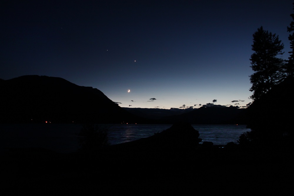 © Phil RandallThe attached picture is of the triple conjunction over Lake Wenatchee in Washington State.It was taken this evening (June 20th) at about 10.30pm or so. The star to the left of Jupiter is Regulus and you can just make out Castor and Pollux to the left of the tree. And for good measure, there is a dead tree in the foreground.
