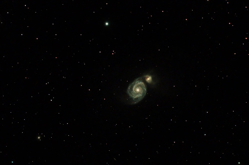 © Peter JenkinsM51 - 5 useable frames (8 taken) each 5 minutes long on 2nd May 2014. William Optics FLT110 refractor with 0.8x reducer/flattener on a pier mounted NEQ6.Camera used was an QHY8L one shot colour camera (6.5 megapixels) with a Astronomik CLS filter (filters out light pollution). Guided using a William Optics ZS71 refractor with a