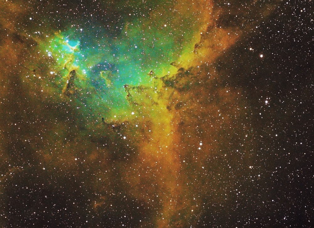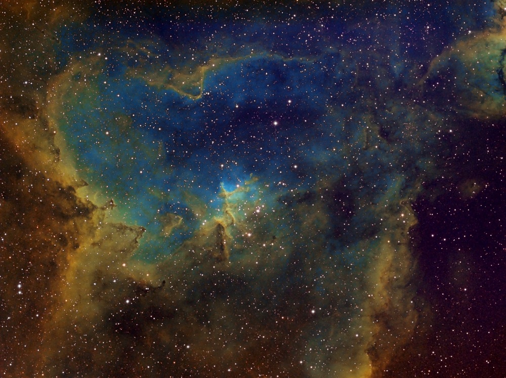 Processed in the Hubble Palette (Ha mapped to Green, OIII mapped to blue and SII mapped to Red). Taken with my Officina Stellare 115mm scope and Atik 383L+ mono camera.