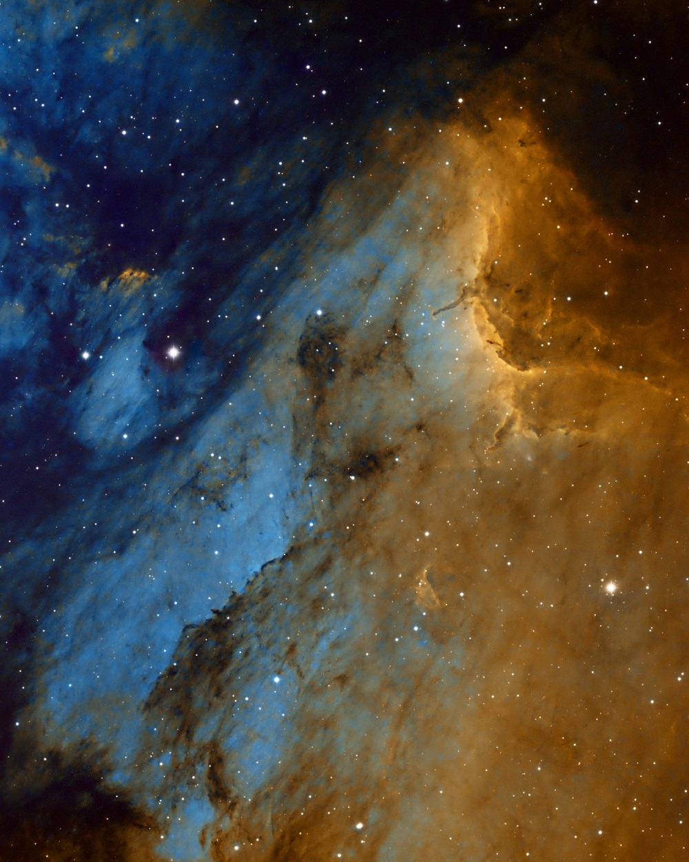 Processed in Hubble Palette, there are 20 x 5min Ha, 15 x 10 min OIII and 12 x 10 min SII - total of over 6 hours exposures.