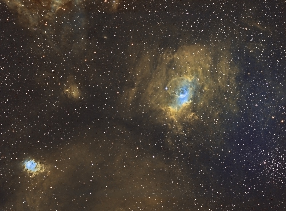 © Peter JenkinsNGC7635 The Bubble Nebula an emission nebula in the constellation Cassiopeia some 7100 light years distant. Also in the photo (lower right) is M52 an open cluster and NGC7538 (Dreyer's Object) lower left which is 9100 light years distant.The photo was taken over two weeks with only short spells of clear sky and is over 12 hours of exposures in total 16 x 15 minutes each through Ha, OIII and SII. Photo using the Hubble Palette.