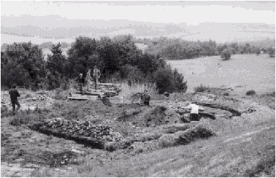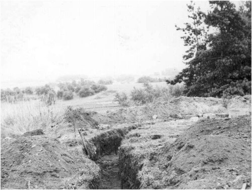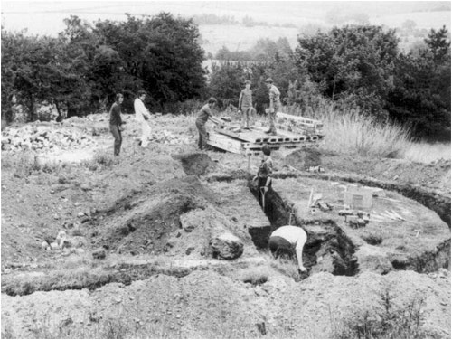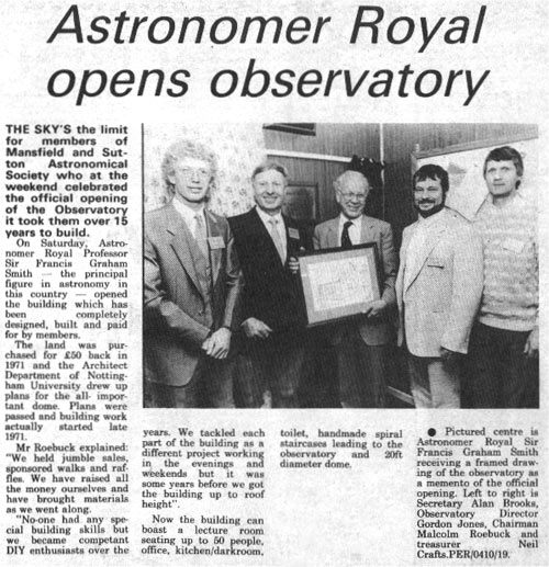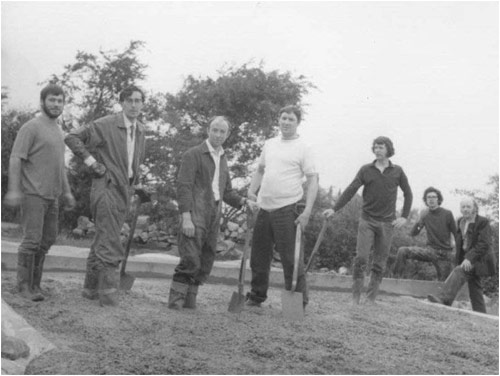 © MSASMembers of the society well on the way to completing the digging on the observatory foundations in 1972.The semi-circular trench towards the right side of the picture now forms the foundation-trench for the main observatory dome, whilst the large square hole being excavated in the foreground ultimately became the base for the main 61cm telescope and its pier.