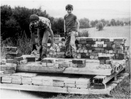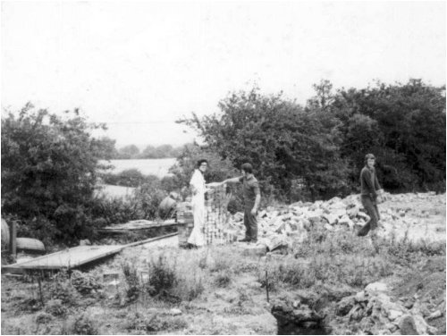 Towards the back of the image the two society members standing on the raised platform are starting to clean up several thousand reclaimed bricks.
