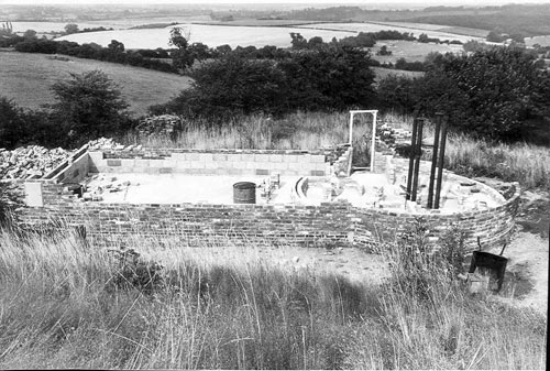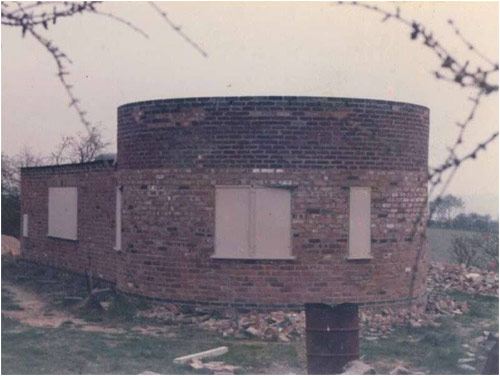 © MSASThis photograph, taken in the mid 1970's shows the start of the brickwork for the Sherwood Observatory, viewed from the bank looking (roughly) towards east-north-eastThe original doorway is framed centre-right, and the four main pier support beams are clearly evident, though the cubic metre of concrete into which the base of each support is sunk isn't visible in this picture.