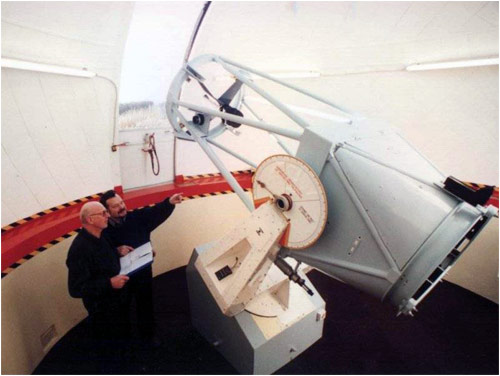 © MSASGordon and Malcom inspect the 61cm Newtonian Reflector telescope housed within the dome at the Sherwood Observatory.The image shows the telescope pretty much as it is today with a couple of small exceptions (the image at the bottom of the page shows the most recent view of the dome and the scope).