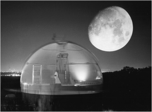 During the long-exposure picture of the observatory the dome was gradually rotated so that light from inside the dome, shining through the open aperture gives a translucent appearance to the dome itself.