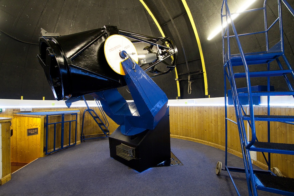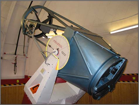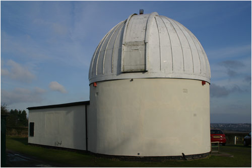 © P. DingleyThe constellation of Ursa Major, also known as The Plough or the Great Bear, is prominent over the top of the dome during the open evening on November 29th 2003. The orange coloured glow pervading the image is due to the local light pollution from the nearby town of Mansfield, and the sodium street lighting on the nearby Coxmoor Road.Thankfully since his picture was taken the local street ilghting has been changed from the open style sodium lights to full cutoff lighting which is far more dark-sky friendly, and means that the public money spent on lighting the streets is doing just that, instead of being wasted pointlessly lighting the sky.