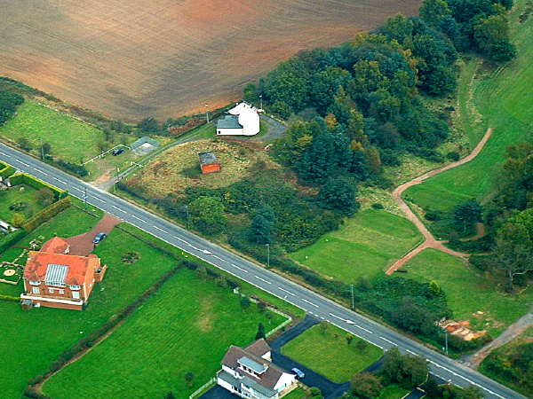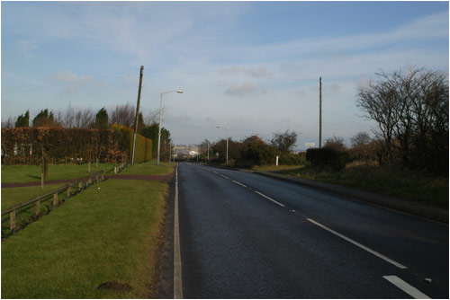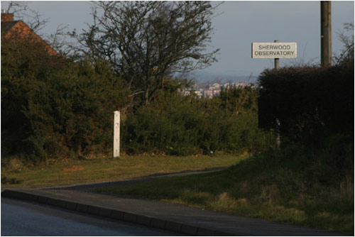 © P. DingleyCrossing, or turning off the A611 at the Coxmoor road junction heading towards Mansfield, the road crests a hill, and turns gently towards the right. Immediately after the corner, the road opens out into the picture below.The entrance to the Observatory is on the right just before the white post in the image. A clearer view of the entrance can be seen in the lower two images on this page.