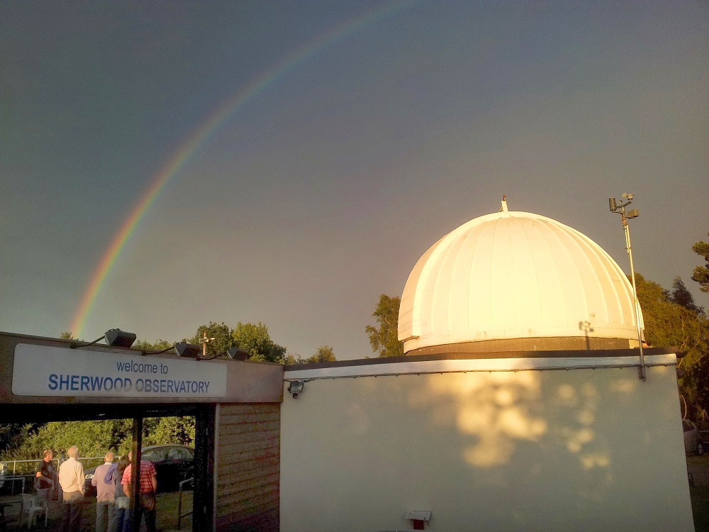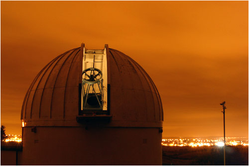 © P. DingleyDuring a cloudy evening in the middle of National Astronomy Week (August 2003), light pollution from the nearby town of Mansfield turns night into an eerily coloured day in this long-exposure photograph of the Observatory dome.Thankfully in reality while it is a nuisance, even this apparent level of light pollution doesn't cause too much of a problem on a clear night.